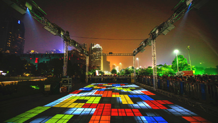 Carpets(魔氈傳說)》,是一組高空地面投影作品,該方案最吸睛的亮點是具備豐富奇妙的互動性,踏上魔氈,即可開始美妙的穿越之旅,了解廣州美麗神秘的故事和傳說。通過8臺Vivitek(麗訊)D5010工程投影機及互動裝置,將尺寸為300平米的巨幅圖案投射在地面,并會根據(jù)人們的腳步移動而變化,為本次燈光節(jié)增添了更多互動性和趣味性。Vivitek(麗訊)D5010是一款單燈370W專業(yè)工程投影機,擁有6000流明亮度,