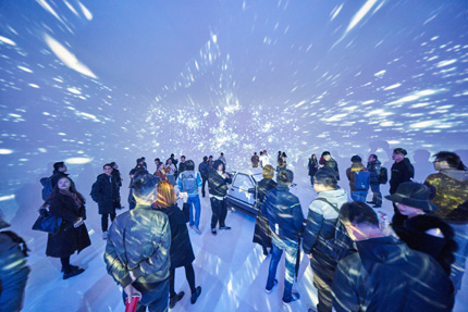 Show于1月4日和1月5日晚19:30在上海市黃浦區(qū)龍華東路世博園激情上演,舞臺區(qū)為一個大型立方體,立方體內(nèi)部的五個空間為影像投影區(qū),9臺Vivitek(麗訊)DU8090Z激光投影機分布在舞臺周圍,并搭配3種不同焦距的鏡頭,投射出長10.88米、寬14.87米、高5.07米的3D立體影像,