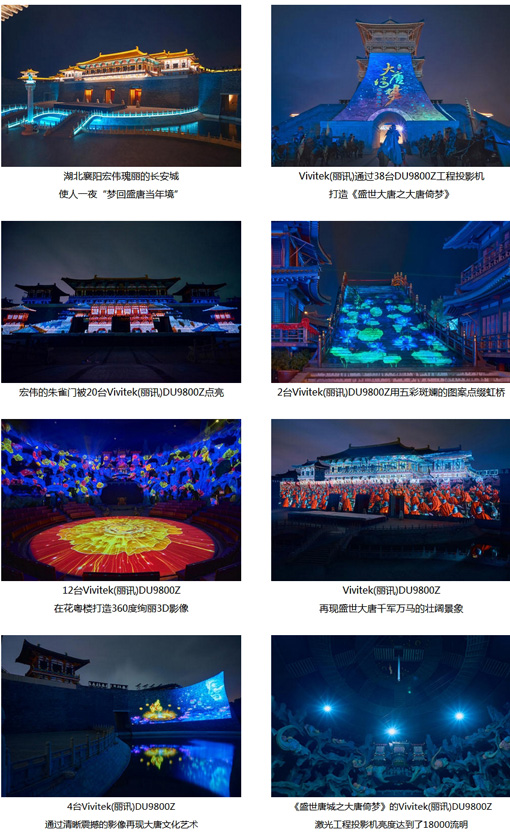中國(guó)大型嵌入行進(jìn)式全景秀《盛世唐城之大唐倚夢(mèng)》是一場(chǎng)顛覆傳統(tǒng)表演形式的全景式饕餮盛宴。利用數(shù)字多媒體、裸眼3D、聲光電交互等技術(shù)穿越時(shí)光,通過開放性線路和多點(diǎn)式呈現(xiàn),全景演繹夢(mèng)回大唐。作為《盛世唐城之大唐倚夢(mèng)》的主要影像設(shè)備,Vivitek(麗訊)共采用了38臺(tái)亮度為18,000