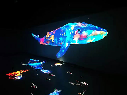 V303H+(3000流明、1080P分辨率),搭建了一個(gè)四面環(huán)繞的沉浸式數(shù)字展廳。