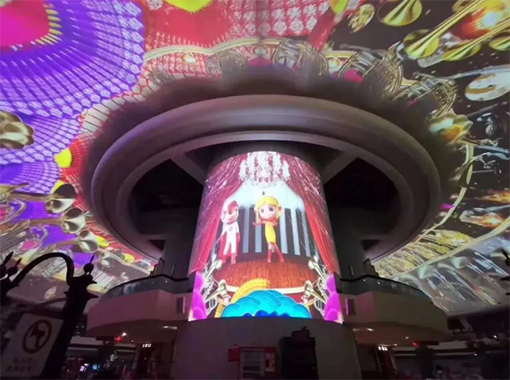 巨大的環(huán)形穹頂畫(huà)面震撼,營(yíng)造出良好的沉浸感。而立柱作為連接地面與天頂視區(qū)的天然橋梁,能夠彌補(bǔ)單調(diào)的橫幅影像表現(xiàn)力的缺失,讓動(dòng)畫(huà)更生動(dòng)、豐富、立體。進(jìn)入0米大廳仿佛穿越了整個(gè)上海,將城市美景盡收眼底。