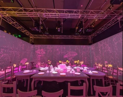 身臨其境的瘋帽子茶話會體驗:在7m×14m的純白色房間內(nèi),實現(xiàn)沉浸式實物投影,投影面覆蓋桌子表面以及從地板到天花板的所有墻壁。